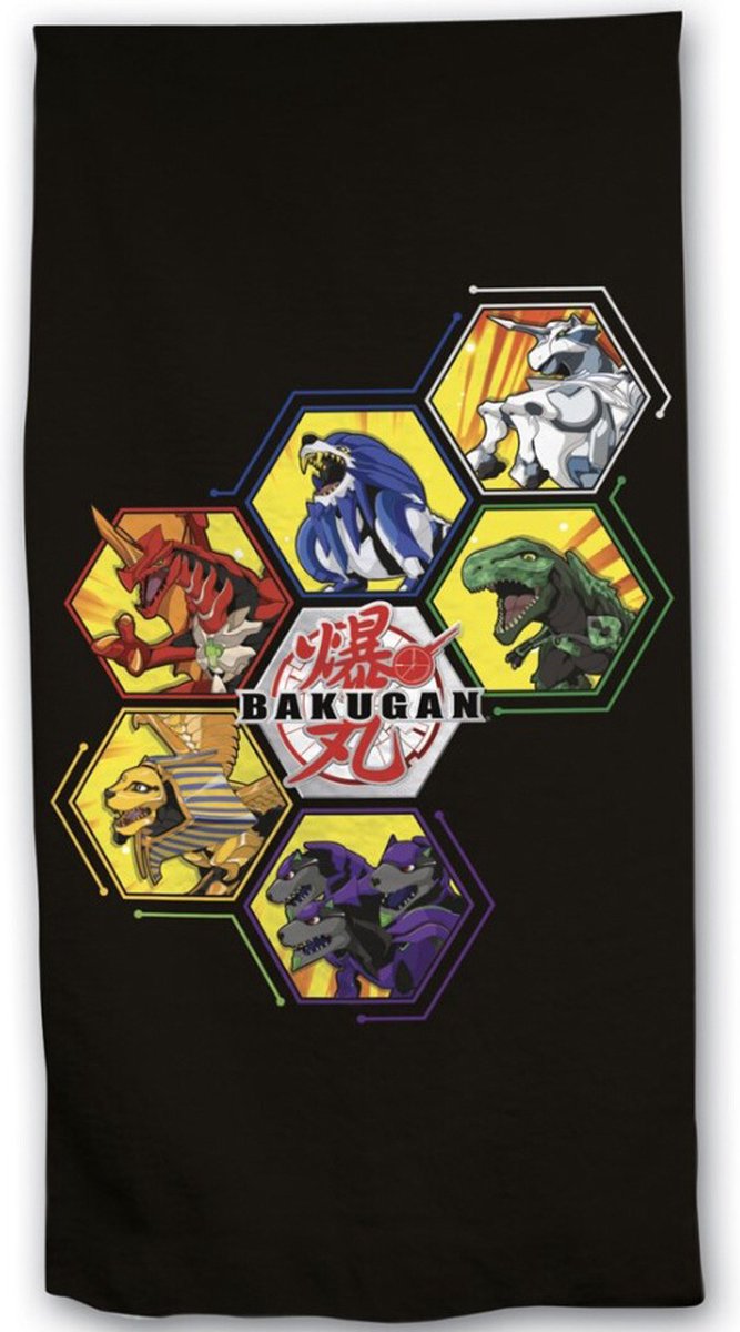 Bakugan strandlaken, ontworpen voor kinderen.Dit katoenen strandlaken meet 70 x 140 cm en is versierd met afbeeldingen van de krachtige Dragonoids uit de Japanse anime-serie 'Bakugan Battle Brawlers'.Het is ideaal voor gebruik op het strand, bij het zwembad of na het baden thuis.Het materiaal is 100% katoen, wat zorgt voor een zachte en absorberende ervaring.Het wordt aanbevolen om het op 30 graden te wassen.