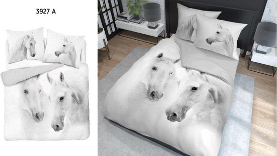 Een dekbedovertrekset met een paardmotief met 3D Effect. Deze set bestaat uit een dekbedovertrek van 220 x 200 cm en twee kussenslopen van 70 x 80 cm, allemaal gemaakt van 100% katoen voor een ademend en comfortabel slaapklimaat. Het 2-in-1 ontwerp biedt variatie, met aan de ene kant een gedetailleerde afbeelding van een paard en aan de andere kant een effen kleur die het beddengoed een andere uitstraling geeft. De set is geschikt voor machinewas op 40°C, kan op een lage temperatuur in de droger worden gedroogd, en mag op een gemiddelde temperatuur worden gestreken. Bleken en chemisch reinigen wordt afgeraden. Dit product heeft geen instopstrook.