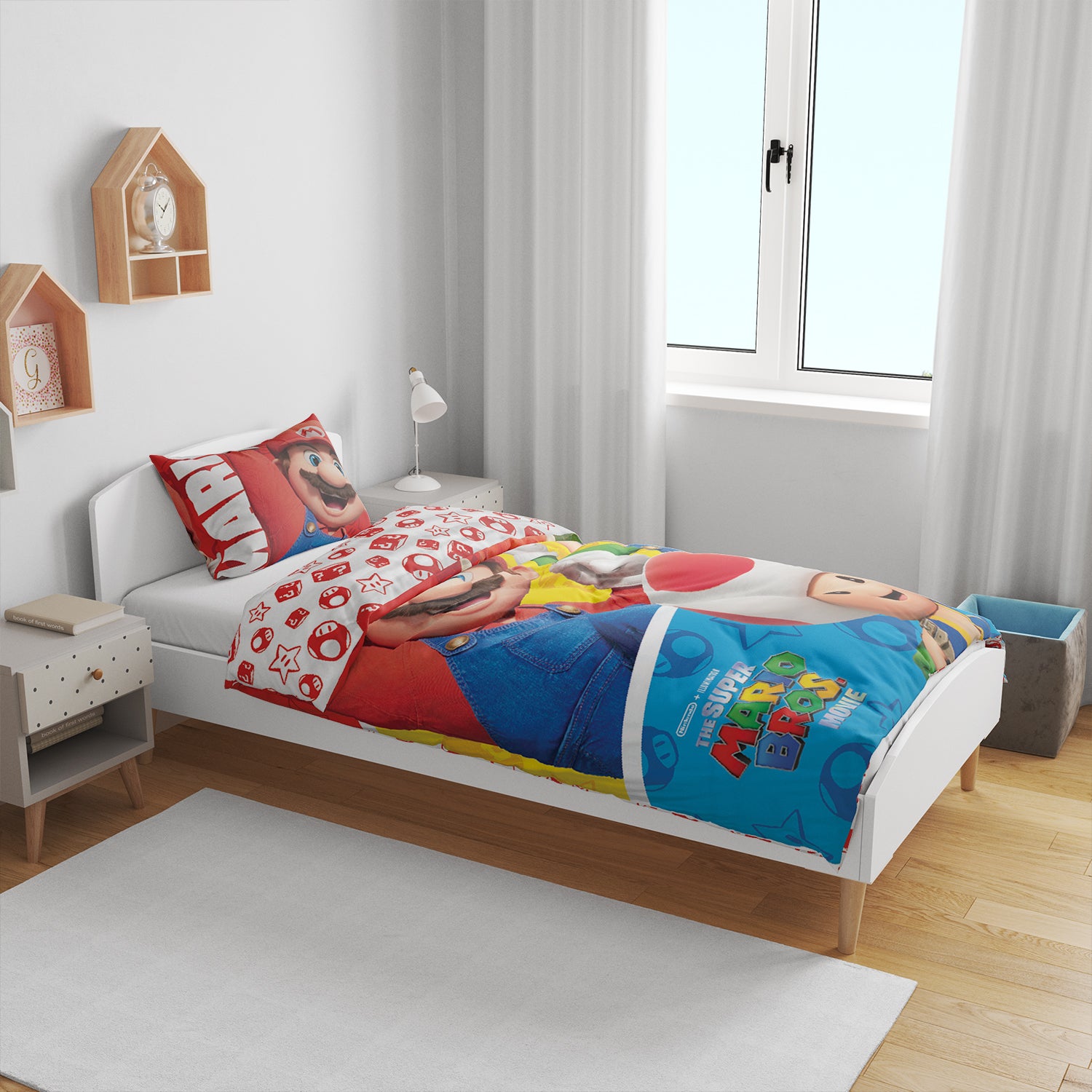 Het Super Mario dekbedovertrek brengt een speelse en kleurrijke sfeer in de slaapkamer. Het eenpersoonsdekbedovertrek heeft is 140 x 200 cm. Ook is er een extra grote kussensloop inbegrepen (70x90 cm). Het dekbed is geïnspireerd door de geliefde game Super Mario en biedt een vrolijke uitstraling. Het dubbelzijdige ontwerp zorgt voor veelzijdigheid en is perfect voor zowel kinderen als fans van deze iconische game. Het dekbedovertrek is gemaakt van 100% Katoen. Het kan gewassen worden op 30 graden maar is niet geschikt voor de wasdroger. Het dekbedovertrek is bovendien voorzien van een ritssluiting die zorgt voor eenvoudig gebruik en is kinderveilig, wat het extra praktisch maakt voor gezinnen. Wassen vóór gebruik wordt aangeraden.
