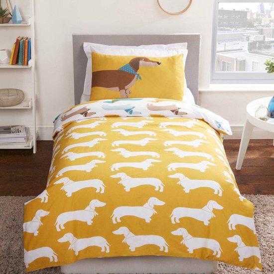 Het Teckel Eenpersoonsdekbedovertrek heeft een afmeting van 135 cm x 200 cm en wordt geleverd met een kussensloop van 50 x 75 cm. Het beddengoed is gemaakt van 48% katoen en 52% polyester, wat zorgt voor een comfortabele slaapervaring. Het ontwerp toont schattige teckels met kleurrijke bandana's op een witte achtergrond, terwijl de achterzijde een bijpassend patroon heeft van witte honden op een gele achtergrond. Het dekbedovertrek is volledig omkeerbaar, wat extra variatie in de slaapkamer brengt. Het onderhoud is eenvoudig, want het is machinewasbaar op 30°C en geschikt voor de droger op lage temperatuur. Dit vrolijke en zachte dekbedovertrek is een perfecte keuze voor een kinderkamer of voor iedereen die van teckels houdt.